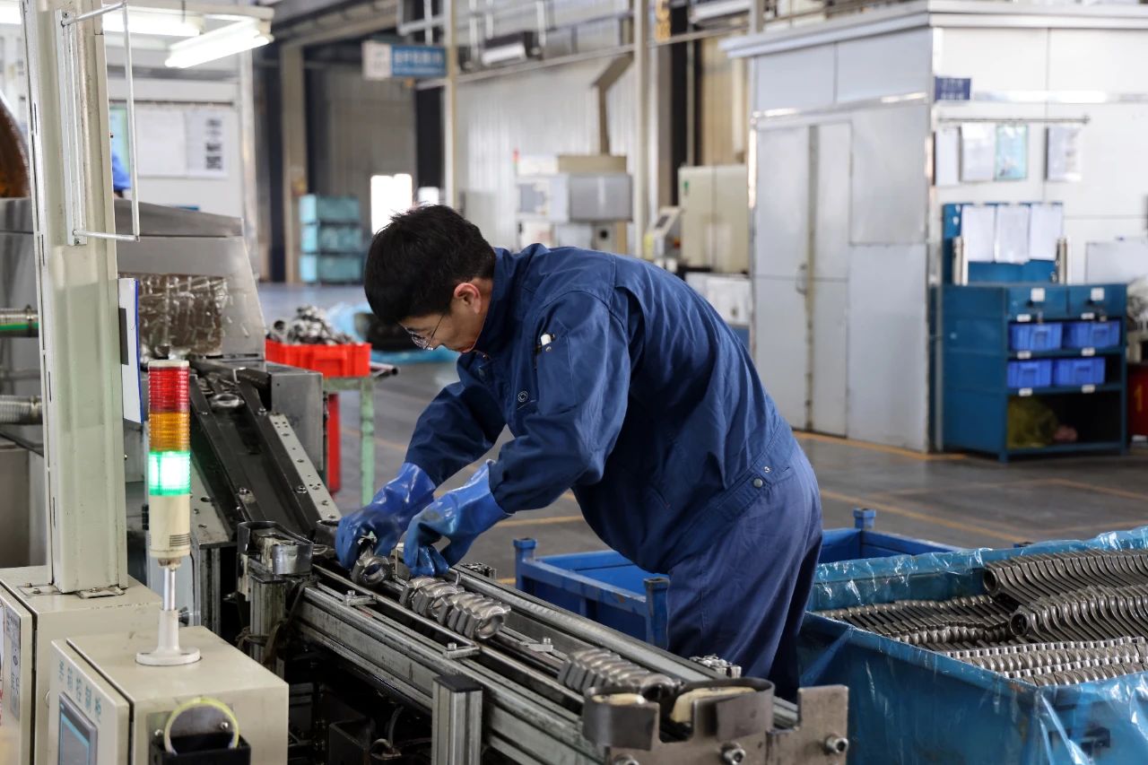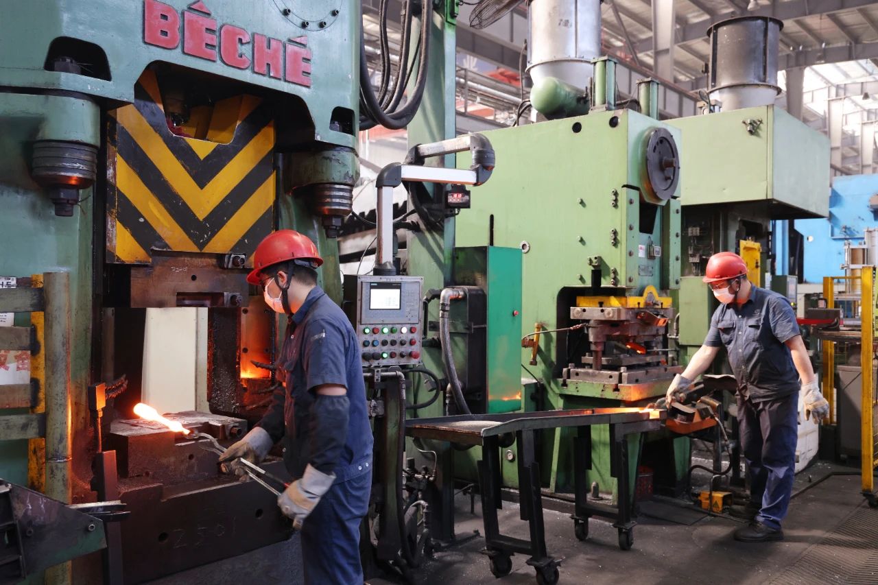 走进白城中一精锻股份有限公司生产车间,一条条精密锻造生产线火力全开,机器轰鸣声、锻造声不绝于耳,剪切下料、中频感应加热、辊锻制坯、模锻、控温冷却、磁粉探伤、产品检测、防腐包装等工艺流程衔接有序,有条不紊,车间内一派繁忙景象。