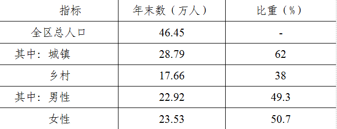 年末全区户籍总人口46.45万人(市辖区),其中城镇人口28.79万人,乡村人口17.66万人。全年出生人口1692人,出生率为3.6‰;死亡人口4146人,死亡率为8.9‰;自然增长率为-5.3‰。