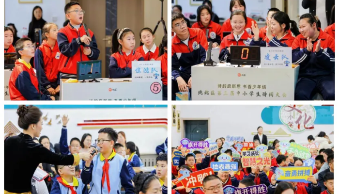 本次决赛活动分为小学专场与初中专场,经过前期线上初赛选拔,全区6大教育集团的48名选手脱颖而出晋级决赛。本次活动由文化小学王佳兴、房昕驰,三中刘俐军,东风中学赵丹四位教师主持,他们从容大方,引经据典,展现出深厚的诗词底蕴,成为赛场上一道亮丽的风景。大赛环节设计精巧,必答题、抢答题、风险题与飞花令四大关卡层层递进,全方位考验选手的诗词积累与临场应变能力。必答题环节,选手们沉着应答、对答如流,尽显扎实的诗词功底;抢答题环节,选手们眼疾手快、团队协作,在紧张比拼中奋勇争先,赛场氛围瞬间升温;风险题环节,选手们或保守或挑战,在分数博弈中展现勇气与智慧;飞花令环节更是点睛之笔,选手们围绕指定关键字才思泉涌、佳句频出,让观众沉浸式感受古典文学的独特魅力。
