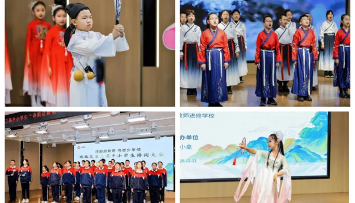 决赛开始之前,全区6大教育集团总校精心选送的文艺表演拉开了活动序幕。参演学生通过吟诵、歌舞、书法等艺术表演演绎诗词意境,彰显出新时代少年儿童对中华优秀传统文化的认同与传承,让现场师生在视听体验中触摸文化根脉,感受青春力量与千年诗韵的共振。